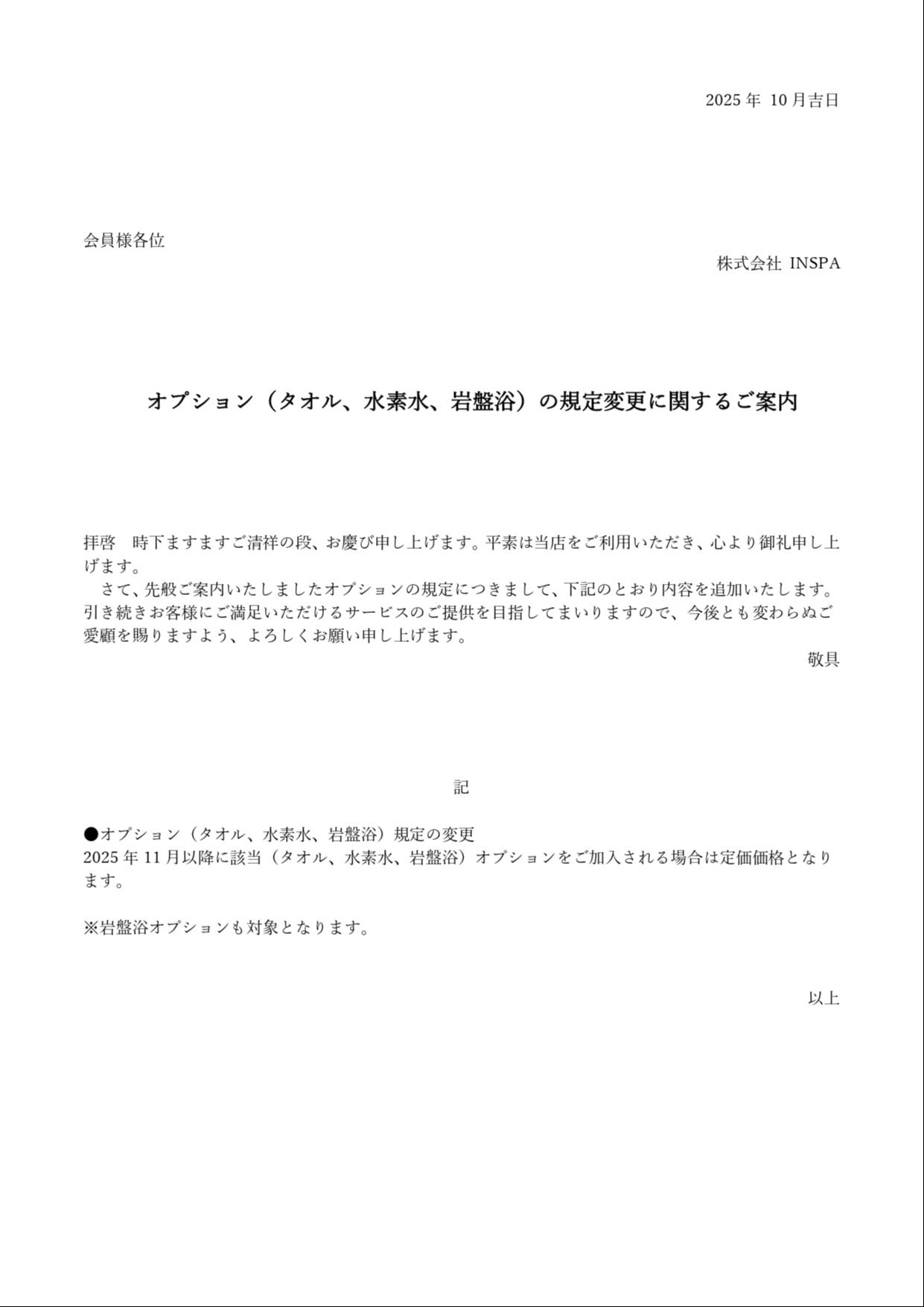 【重要】オプション(タオル、水素水、岩盤浴)の規定変更に関するご案内
